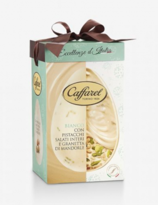 Una golosa ricetta di cioccolato bianco con all'interno pregiati frutti, il connubio perfetto tra il finissimo cioccolato Caffarel e deliziosi pistacchi di Sicilia salati e interi e granetta di mandorla di Puglia. Un uovo dedicato ai palati più fini, un vero capolavoro italiano.