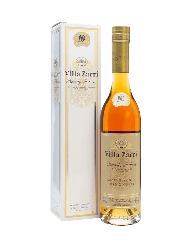 Leonida Zarri è un imprenditore nell’industria dei liquori e distillati, proprietario dell’illustre aperitivo Select. Durante la Seconda guerra mondiale acquisisce un Villa Zarri per usarla inizialmente come residenza estiva di famiglia. Con il tempo questo edificio si specializza nella produzione di Brandy italiano di altissima qualità. Villa Zarri utilizza come materia prima i vitigni Trebbiano di Romagnolo e Toscano, coltivati nelle due rispettive regioni, ideali per produrre un vino poco aromatico, con poco contenuto alcolico, alta acidità ed assenza di solfiti, ingrediente base per brandy di qualità. Il vino viene distillato in due tempi tramite l’alambicco Charentais seguendo il procedimento di Cognac e il risultato è un liquido con 72° alcool. A seguire l’invecchiamento che avviene in botti piccole di rovere francese per ben 10 anni dove, oltre a ricevere i preziosi aromi del legno e affinarsi grazie all’azione dell’ossigeno, il brandy scende a 44° alcool che rappresenta il perfetto grado per esprimere tutti i sapori e sfumature nel bicchiere. Il Brandy Assemblaggio Tradizionale 10 anni è un blend di più annate dove il numero in etichetta rappresenta quello più giovane.